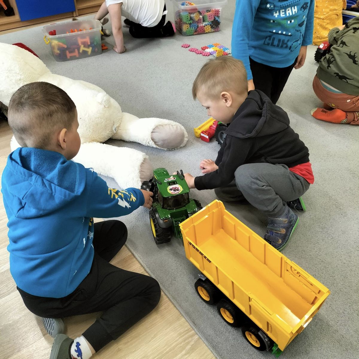 Wspólna wymiana zabawek, tworzenie pomysłów do wykorzystania ich w zabawie stwarza dodatkową okazję do większej integracji dzieci oraz uczy poszanowania cudzej własności.