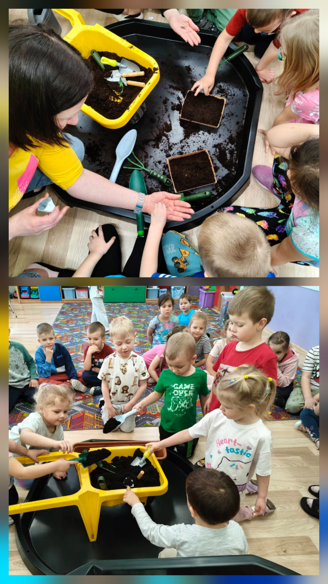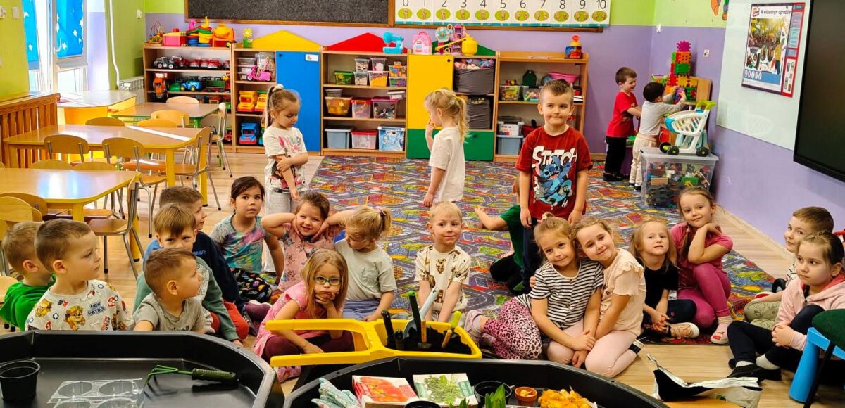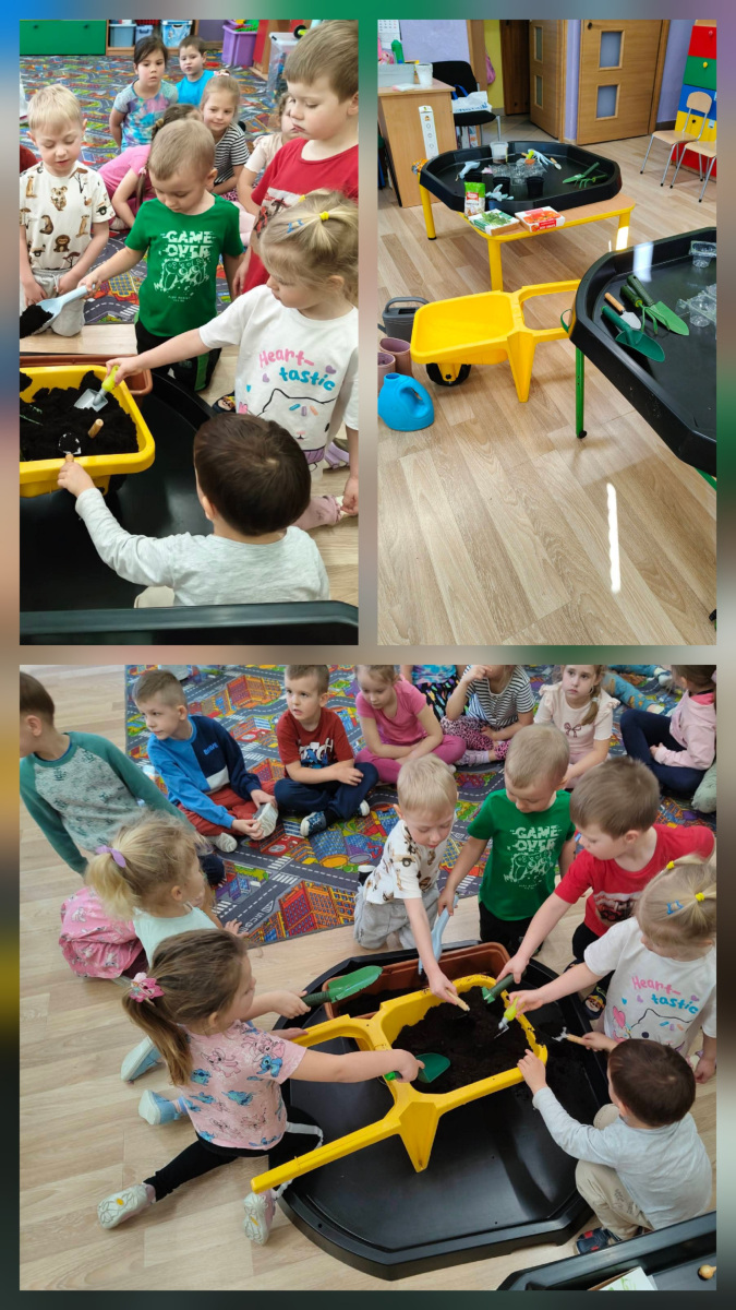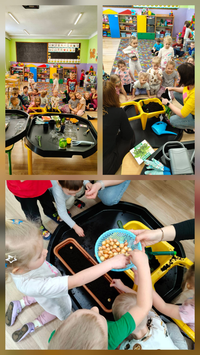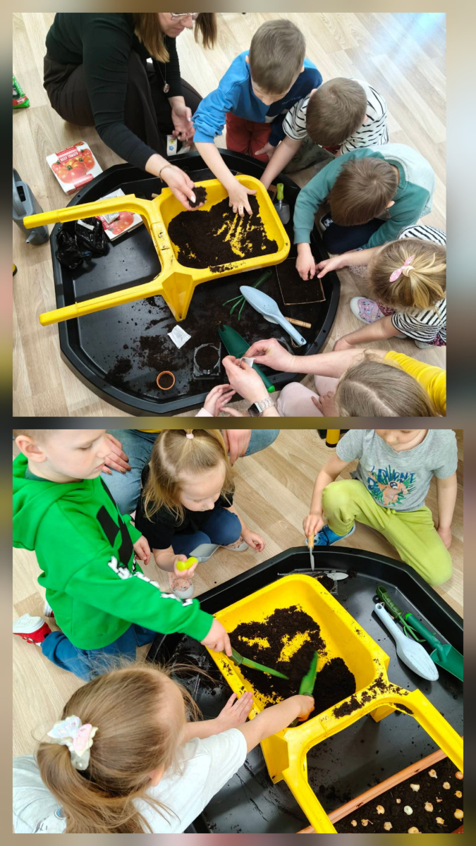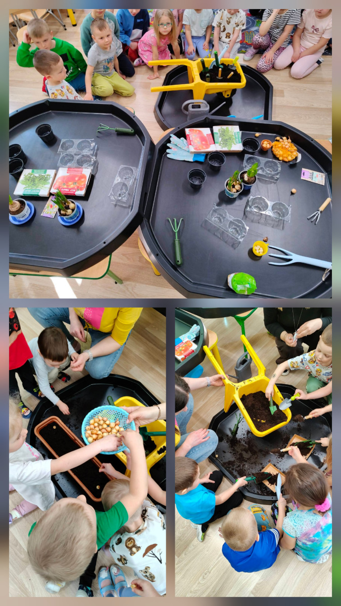 Podczas zajęć dzieci dowiedziały się, jak obudzić śpiące nasionka. Wspólnie sądziliśmy pomidory, rukolę, szczypiorek i kwiaty. Obserwowaliśmy wzrost hiacyntów i szafirków a także eksperymentowaliśmy z fasolą.
